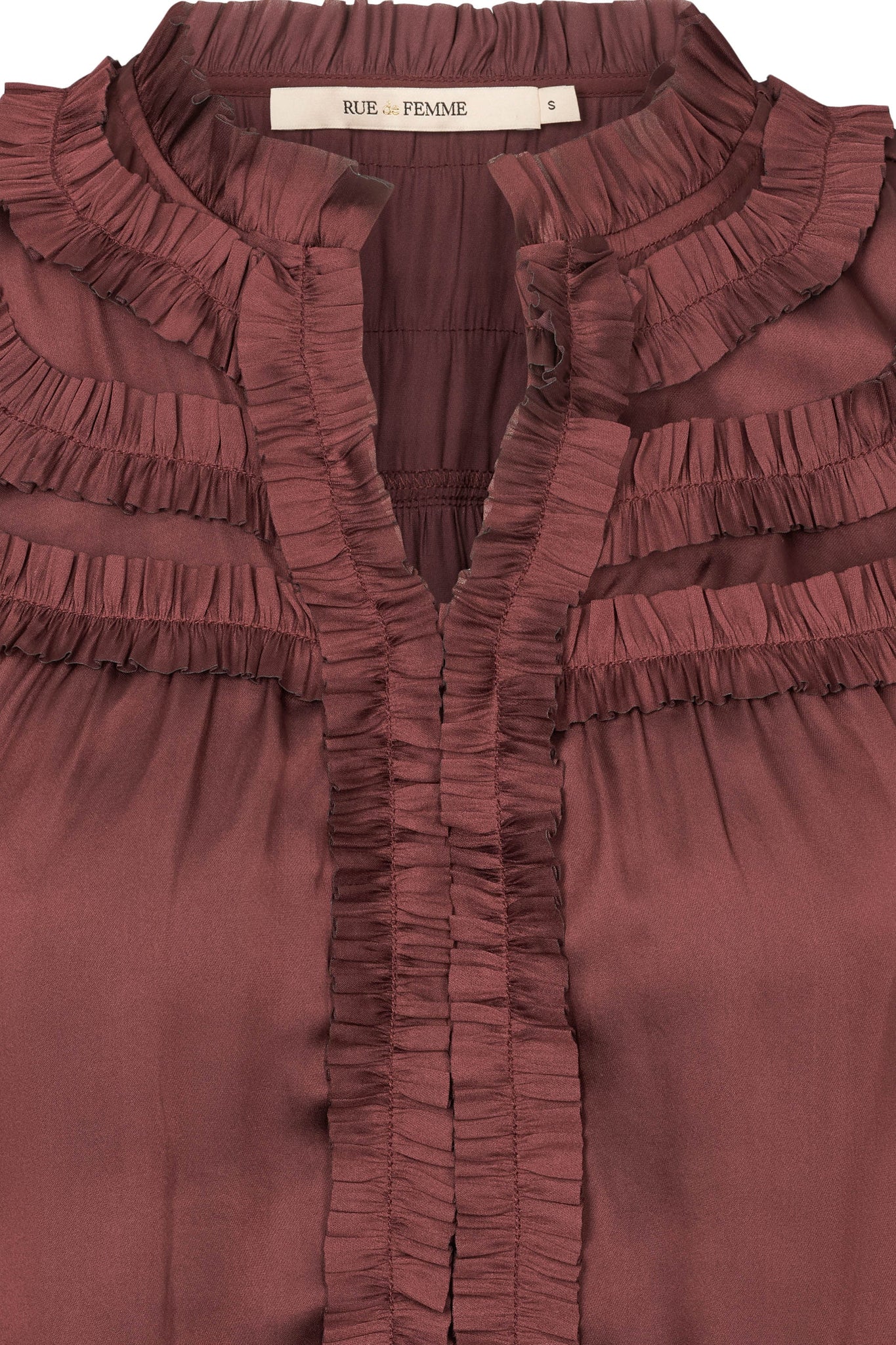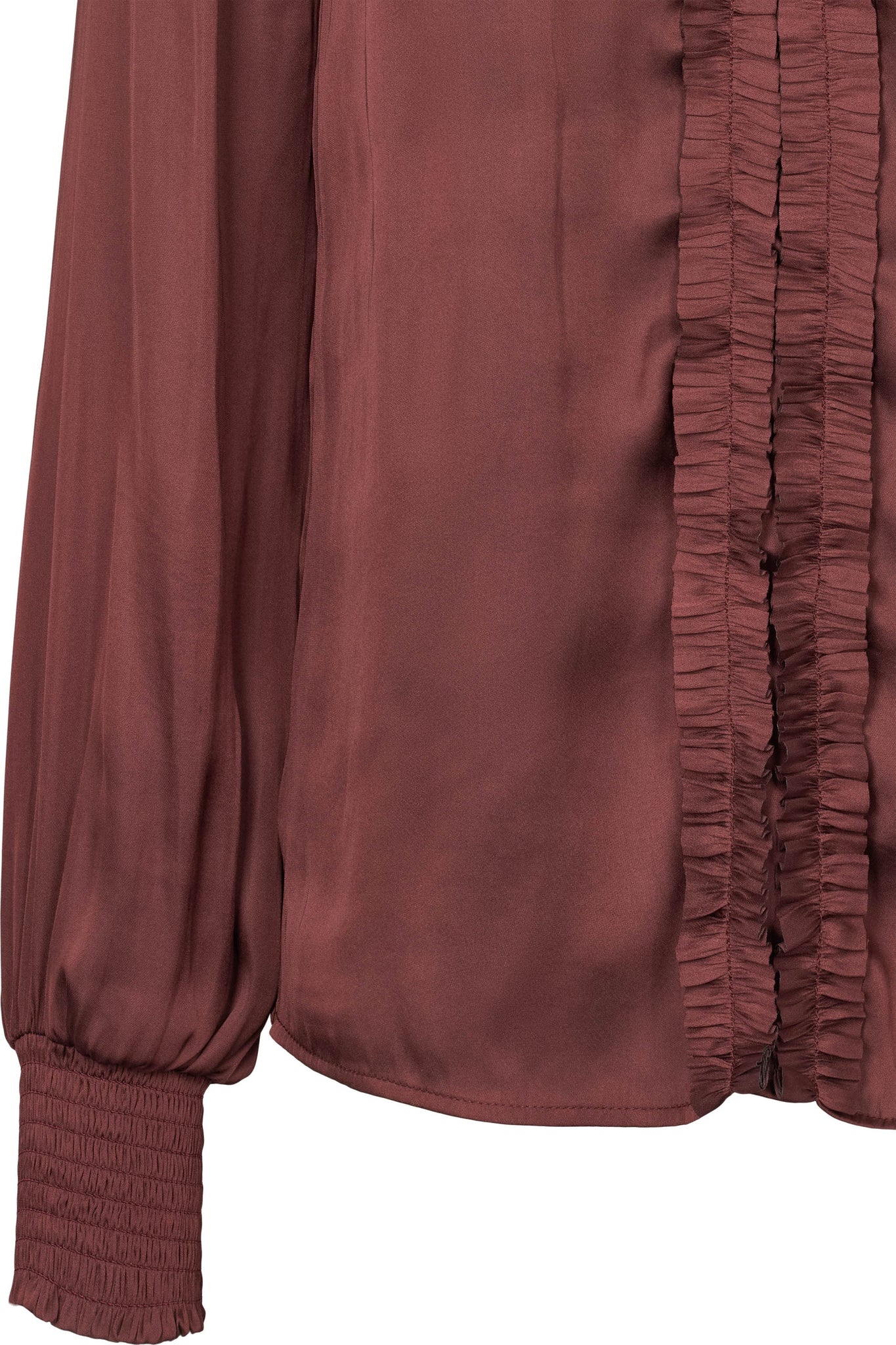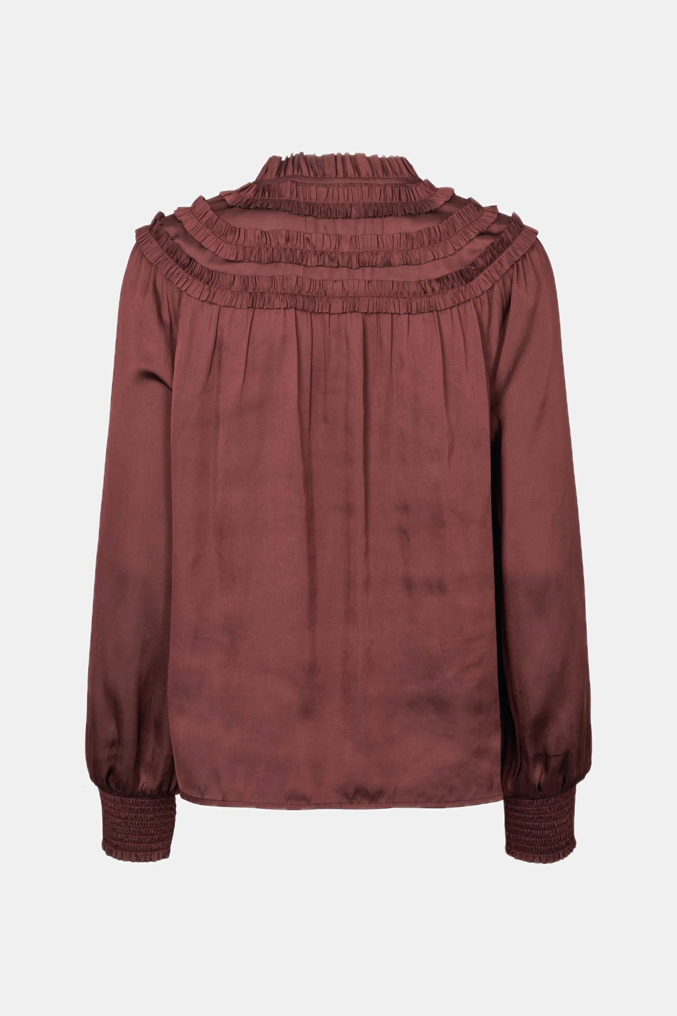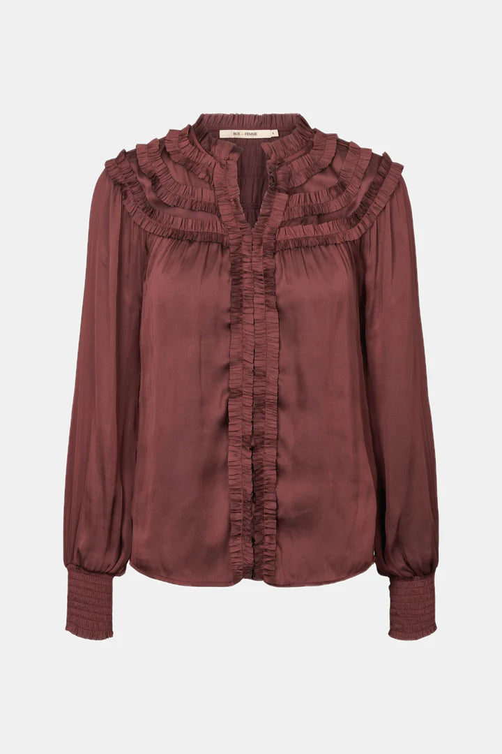 Alba er en feminin langærmet bluse med smockdetaljer ved manchetterne og fine lag af flæser foran og ved skuldrene.