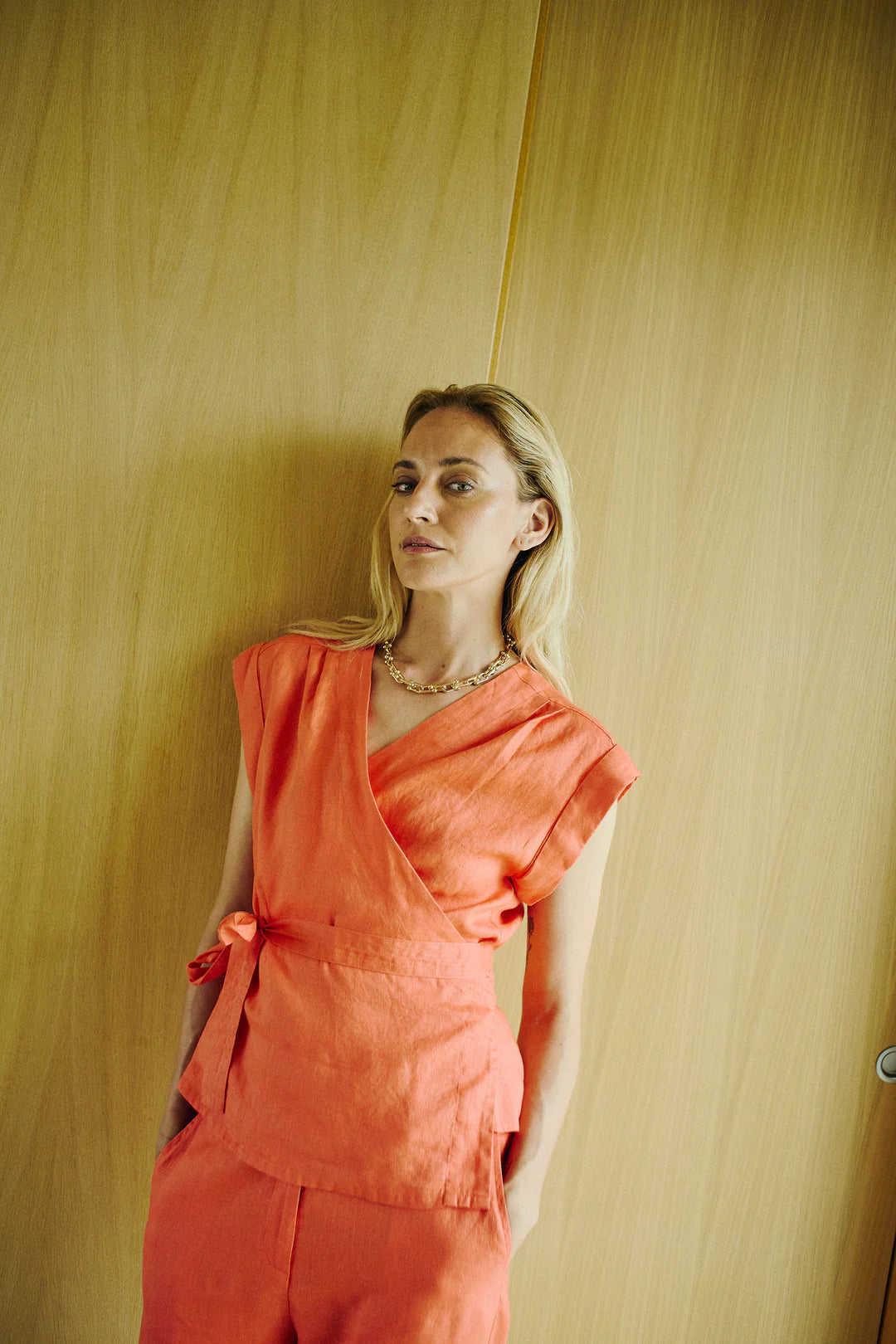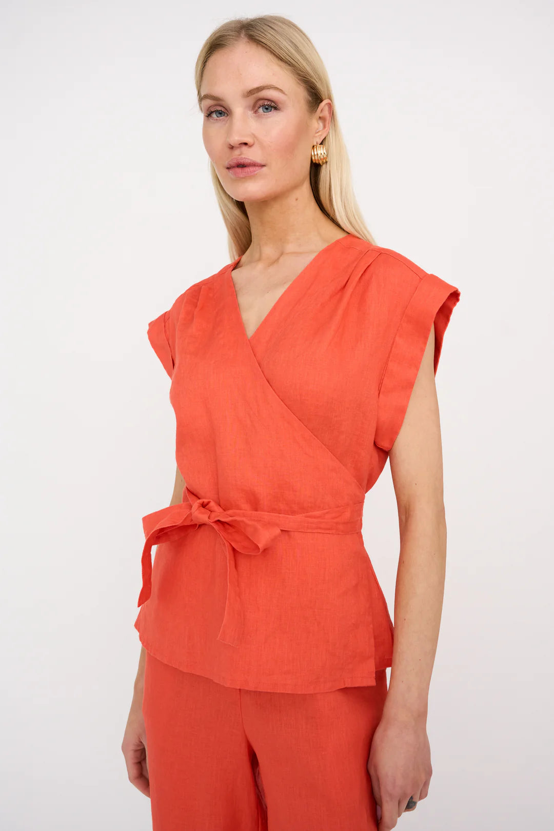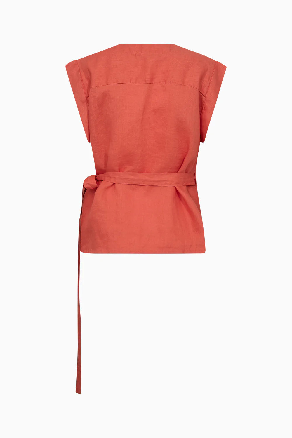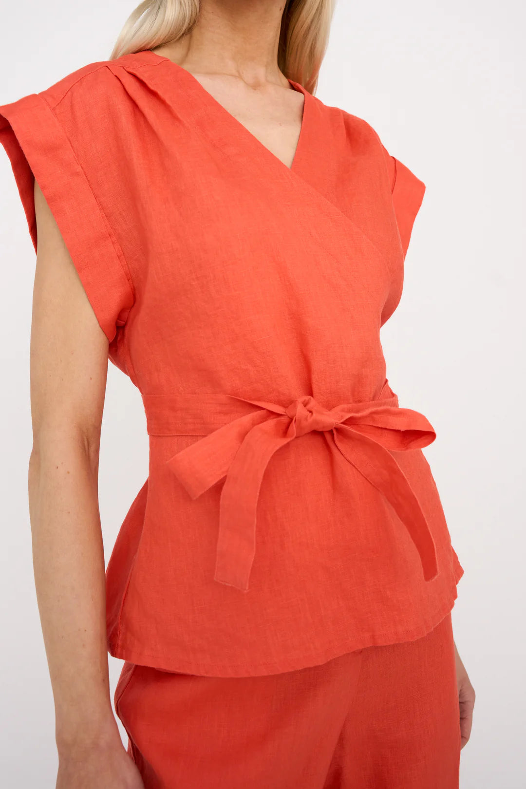 Minimal effort, maximum impact. Lina Wrap Blouse is crafted from crisp linen in a sleeveless design with soft pleats at the shoulders and an elegant V-neckline.
