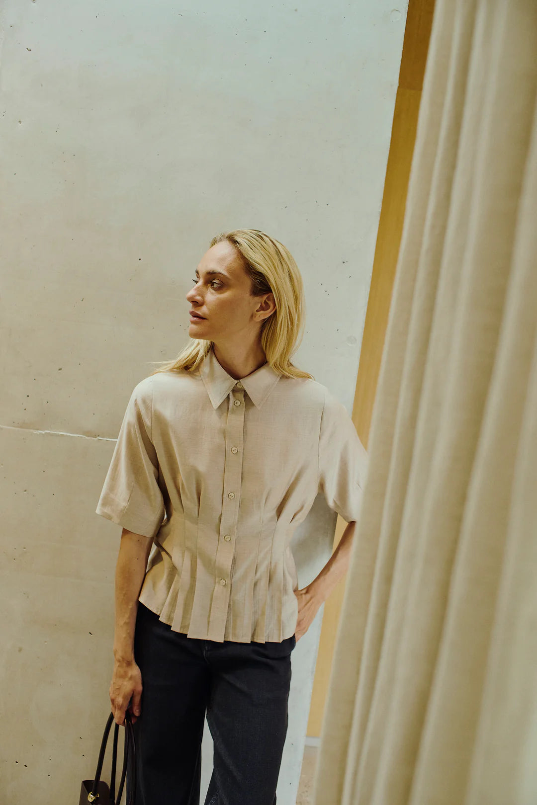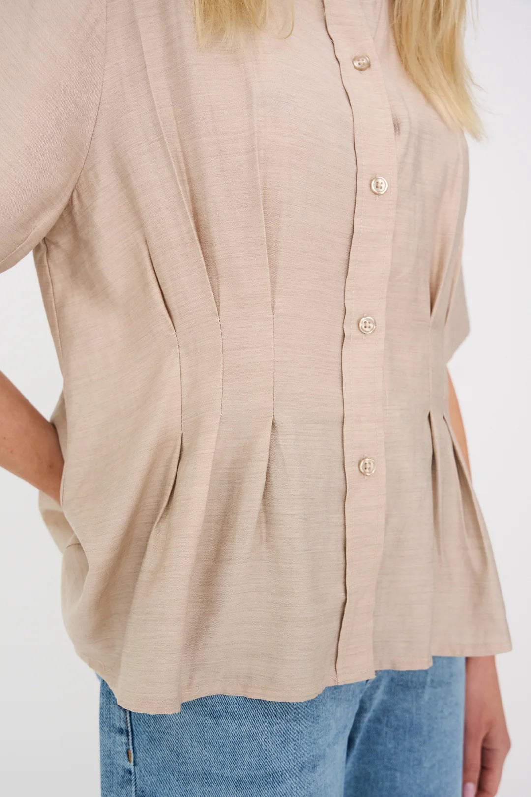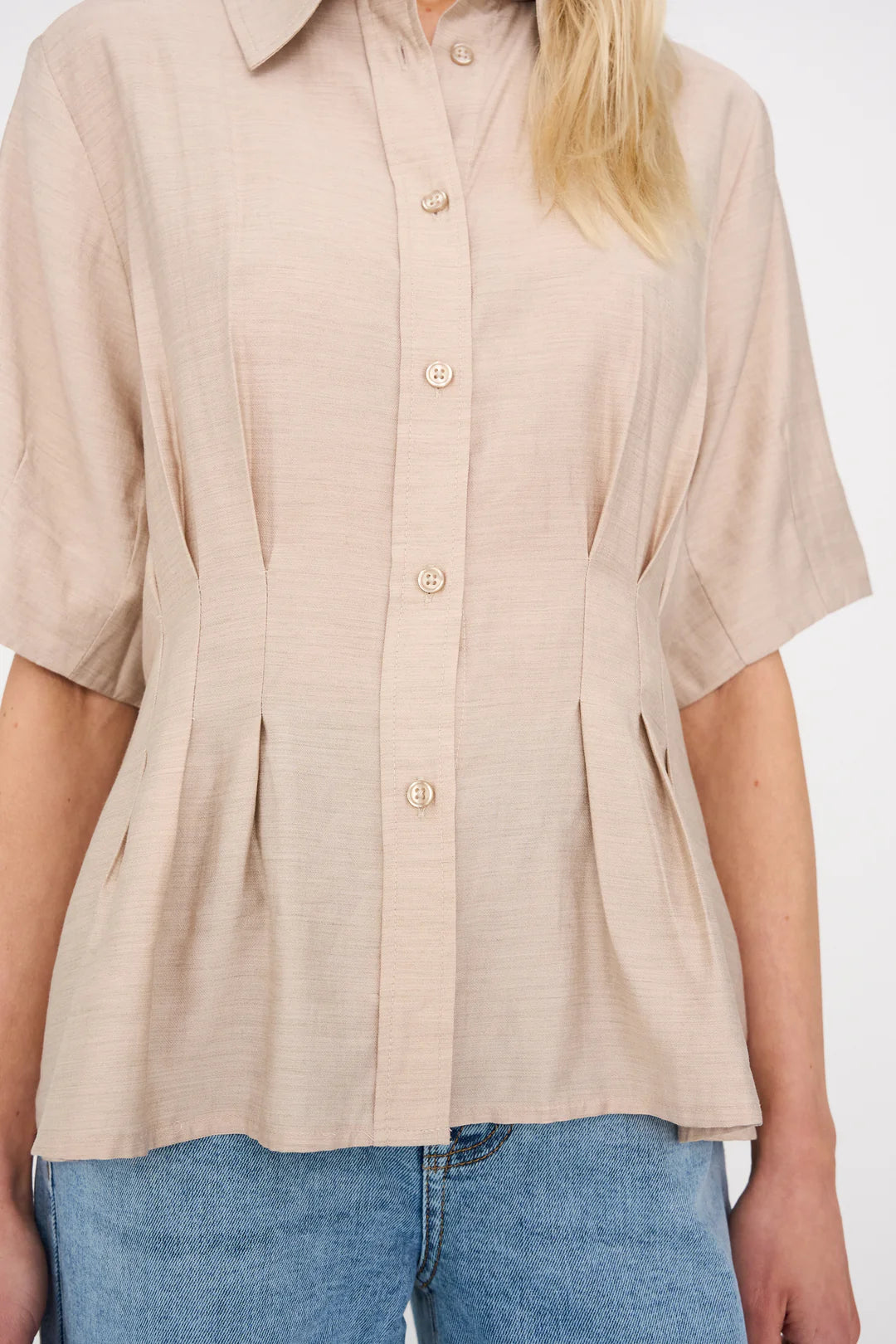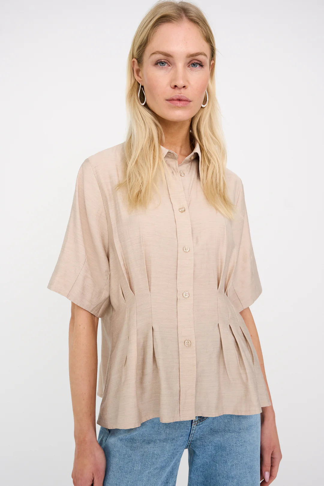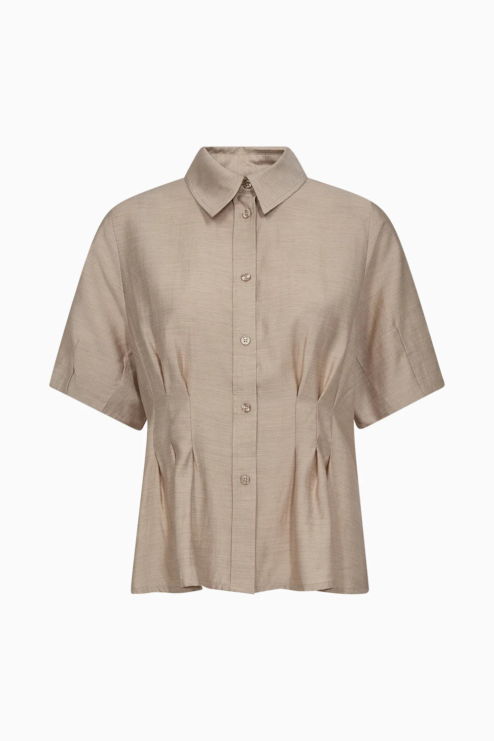 The Viola Peplum Shirt is a tailored take on everyday shirting, designed with subtle pleats that create a softly defined waist and peplum-like silhouette. Crafted from a light melange fabric with a clean button-down front and short sleeves.