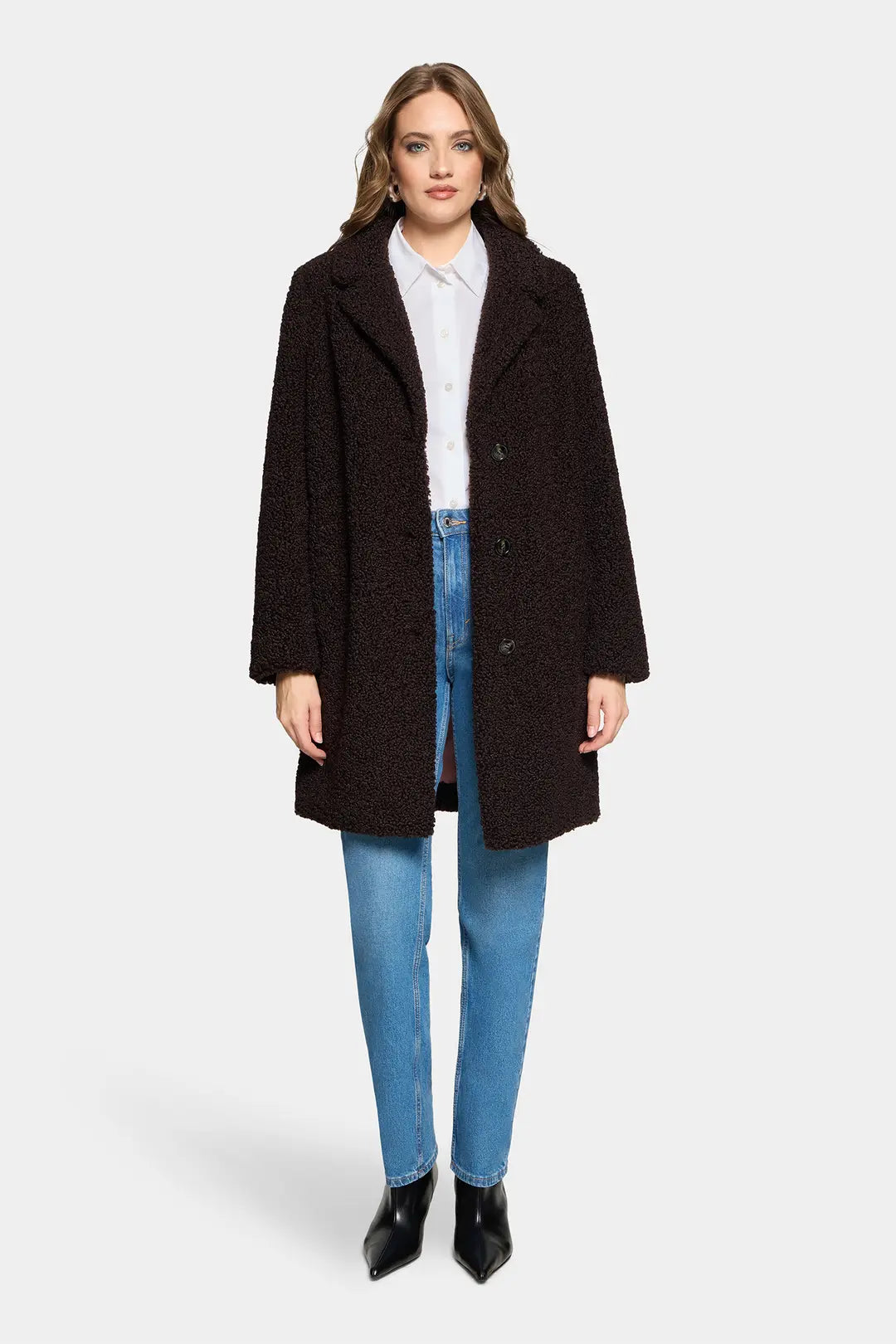 Casual and comfortable faux fur coat in a short, curly quality with collar wings and lapel. Buttoned at front and with simple slit pockets at waist. A cosy everyday favorite.