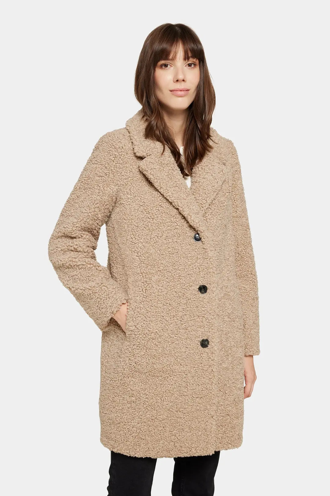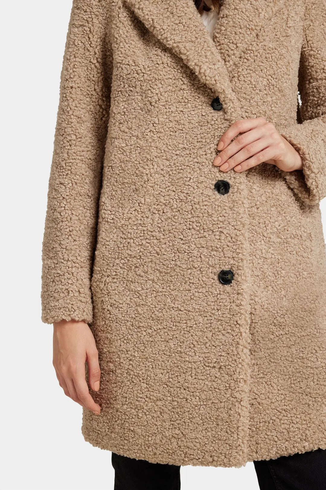 Casual and comfortable faux fur coat in a short, curly quality with collar wings and lapel. Buttoned at front and with simple slit pockets at waist. A cosy everyday favorite.