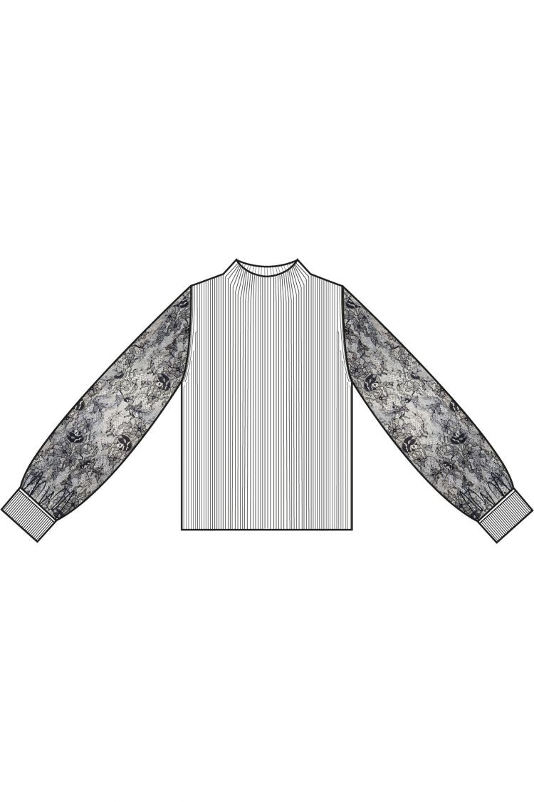 - Sleeves made of transparent lace with knitted cuffs at the end, reinforced with elastane
